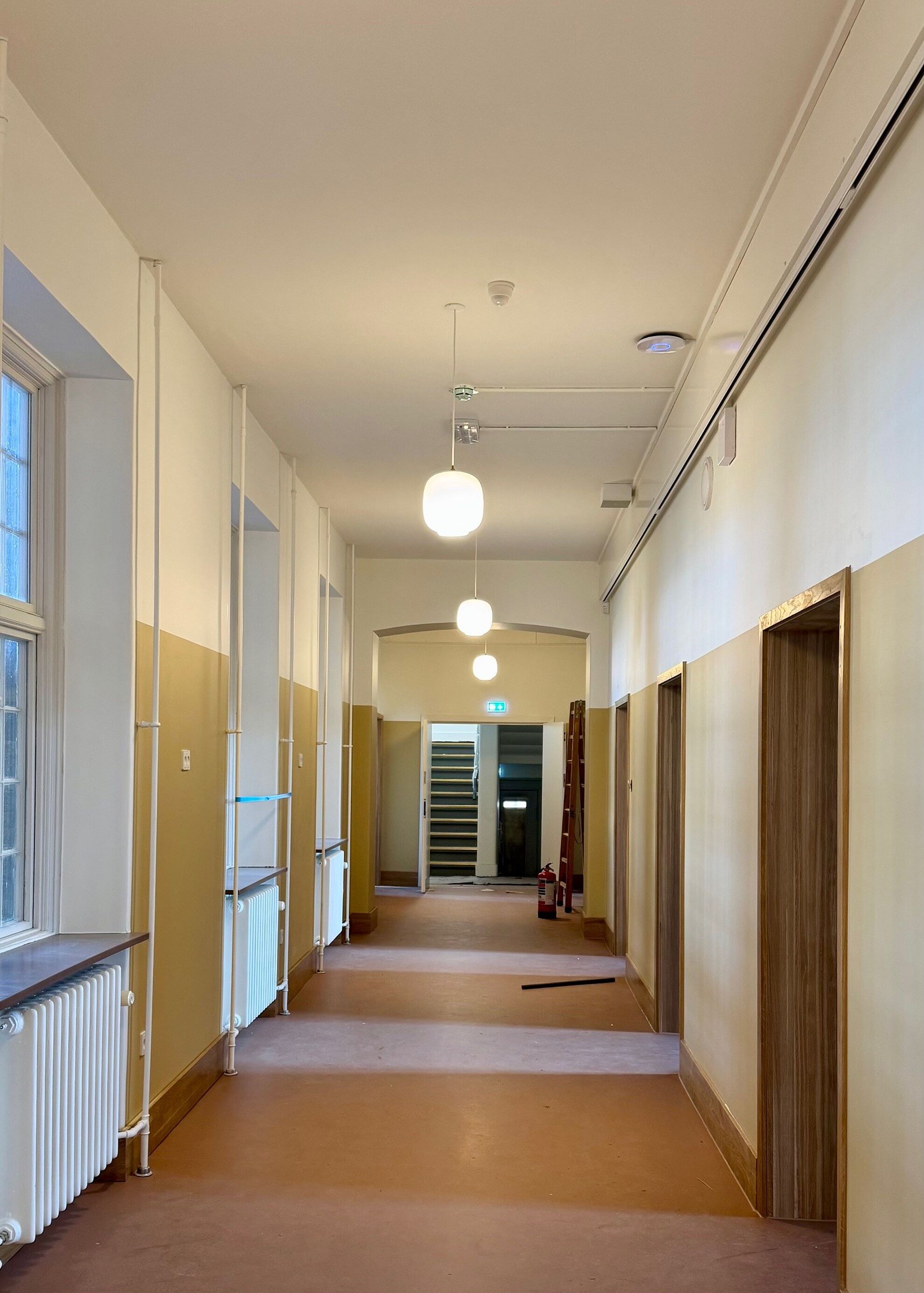 Farverne i stueetagens nyistandsatte gangarealer er valgt ud fra en farvehistorisk analyse af bygningens malingslag