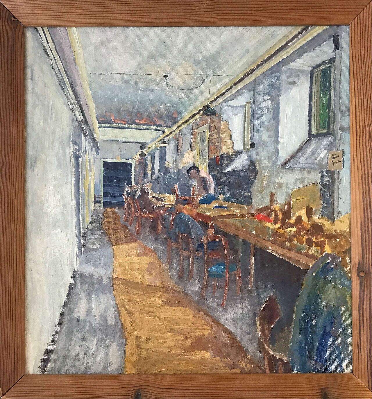 Gert Jakobsen Nelander arbejdede i psykiatrien i 43 år – i lang tid som plejer på Psykiatrisk Afdeling i Middelfart. Her fortæller han om terapiværkstederne. Maleriet er lavet af en patient i 1960erne. Motivet er et terapiværksted i en af kælderetagerne.